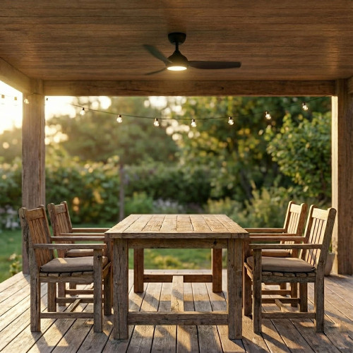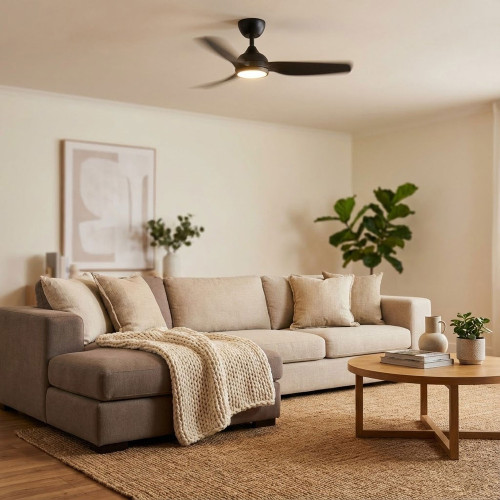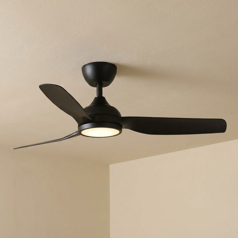 This ceiling fan integrates advanced DC motor engineering with a streamlined, contemporary form to deliver efficient airflow and consistent illumination for modern residential environments. Constructed from durable ABS for the body, canopy and blades, it achieves strong structural stability while maintaining resistance to humidity and environmental variations typical of indoor and covered outdoor settings. Its matt black finish enhances the architectural profile, while the integrated PMMA lens ensures optical clarity and uniform light transmission. With a 1320mm blade span and an 18° pitch, the aerodynamic design maximises air displacement while maintaining low-noise rotational characteristics.