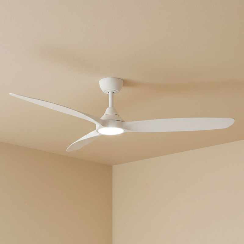 The aerodynamic assembly utilises three precision-balanced ABS blades set at a 16° blade pitch to maximise volumetric air displacement and achieve an airflow efficiency of up to 400m³/hr per watt. The structural platform is formed from a steel body and canopy for long-term mechanical stability, while the PMMA lens cover protects the integrated lighting system and supports uniform light diffusion. The exterior finish is executed entirely in matt white across the body, canopy and blades, delivering a clean architectural appearance with high surface durability.