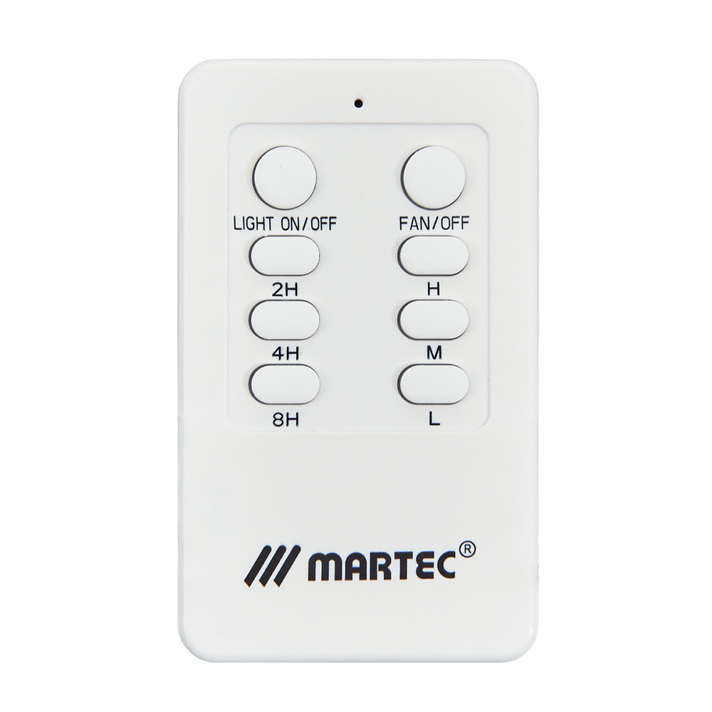 A universal radio frequency remote control with LCD Screen, 3 Speed control Low, Medium, High, with 16 possible code combinations for independent fan control, 2,4,8 Hour timer selection, up to 10m RF operational range, radio frequency 433MHz, soft touch control buttons.