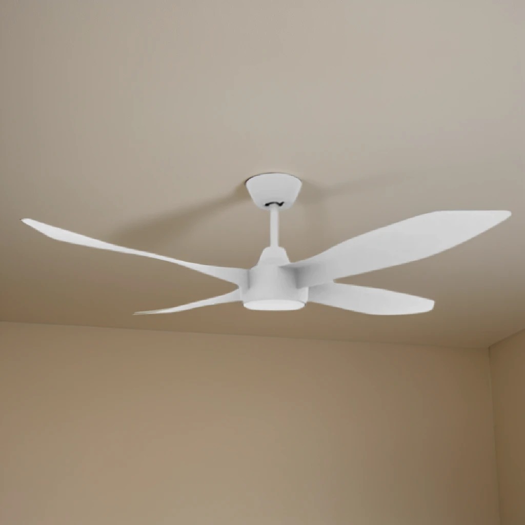 This ceiling fan is a modern, high-performance solution for residential and commercial spaces. Featuring a sleek, plain white design, this 52-inch fan is built to offer both functionality and style. The fan is equipped with four blades constructed from durable ABS polymer, a material renowned for its strength, light weight, and resistance to corrosion in humid environments. The blades are engineered with a 14.5° pitch, optimizing airflow for superior ventilation. This results in an airflow capacity of 14,305 m³/hr, making it suitable for large spaces that require effective air circulation.
